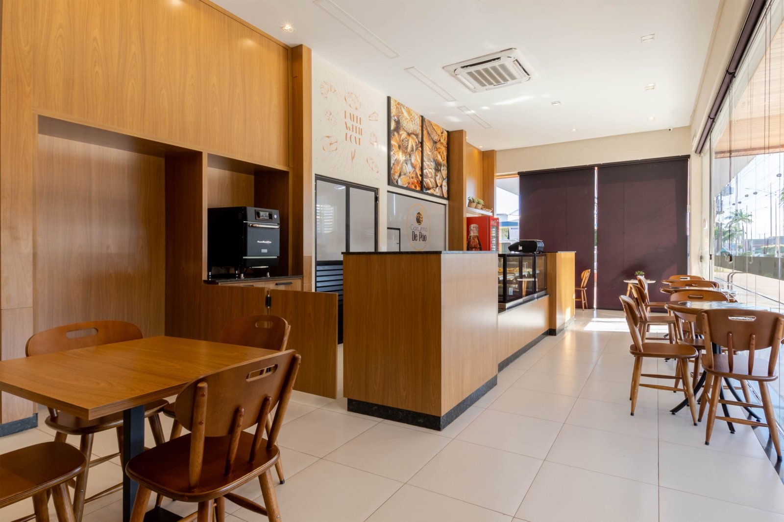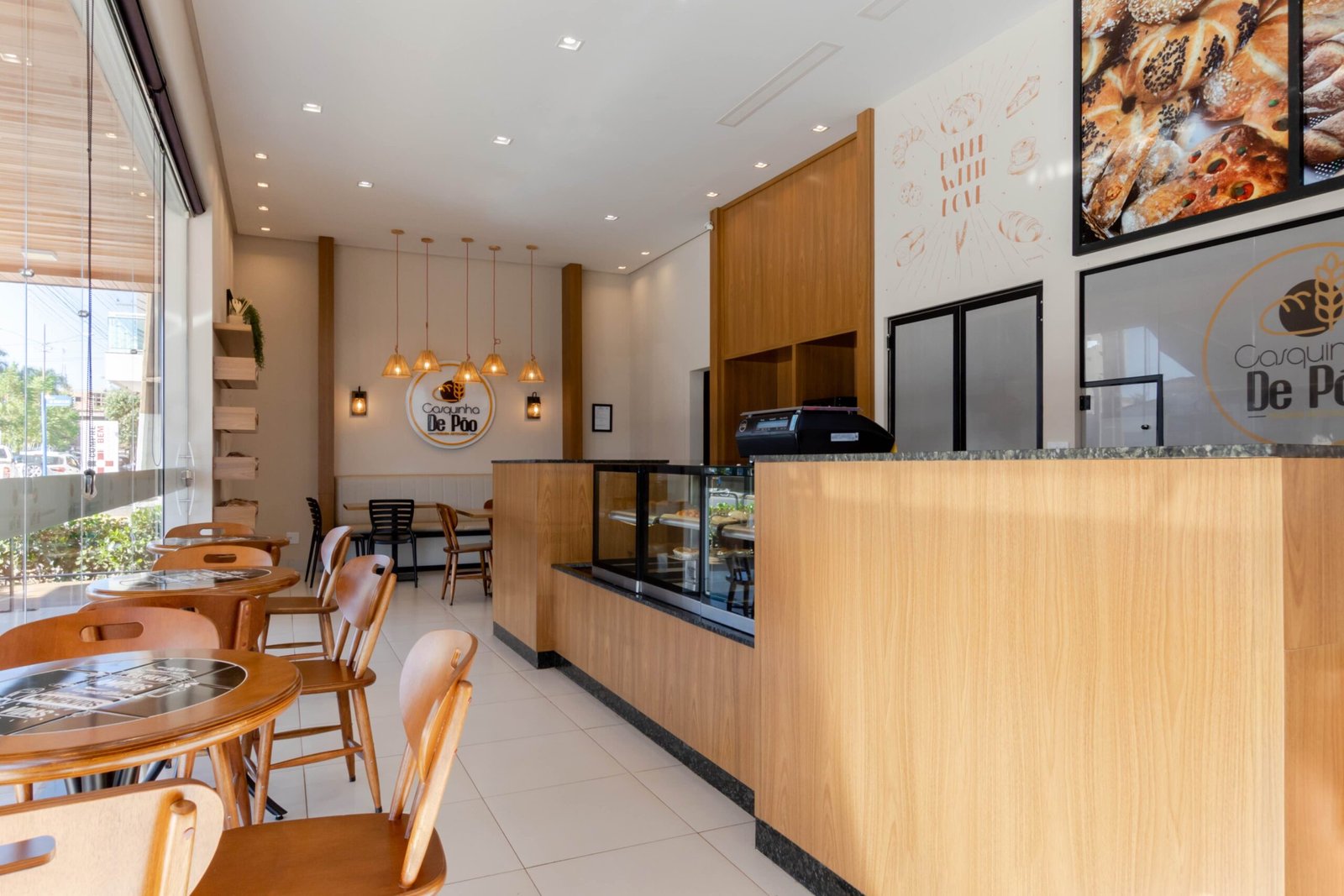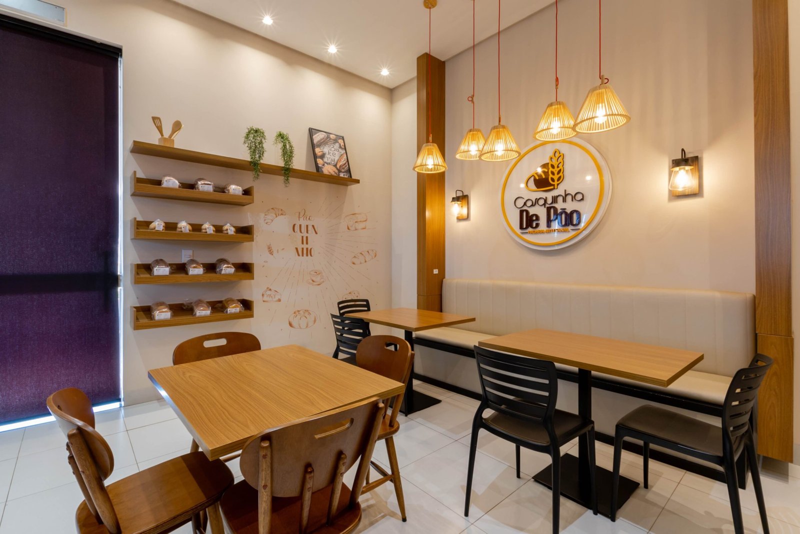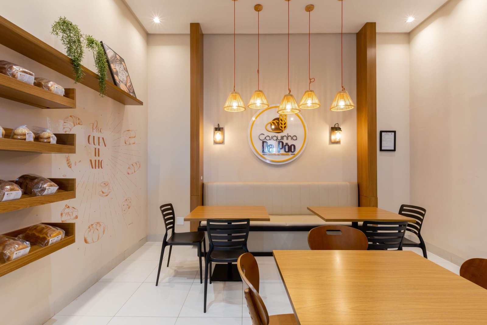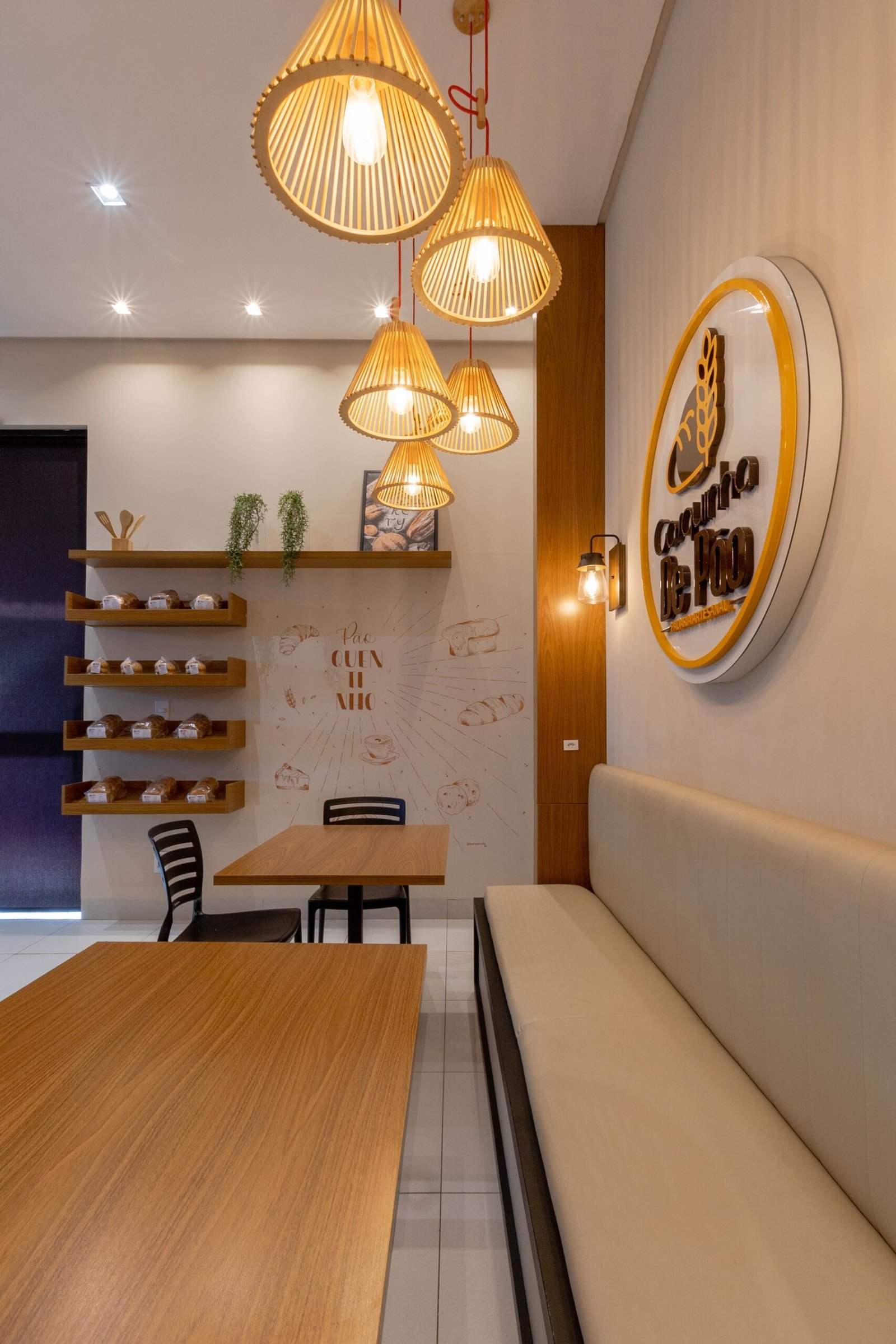 Um padaria que vai muito além de fazer pães. A Casquinha de Pão produz pães de fermentação natural e claro que assim como eles, que possuem um processo longo e paciencioso, nós pensamos em um lugar que fosse acolhedor e tivesse uma bela vista enquanto o cliente toma seu café e aprecia as delicias produzidas ali. Madeira, banco estofado e pendentes em palha tornam esse espaço aconchegante e impossível passar despercebido.
