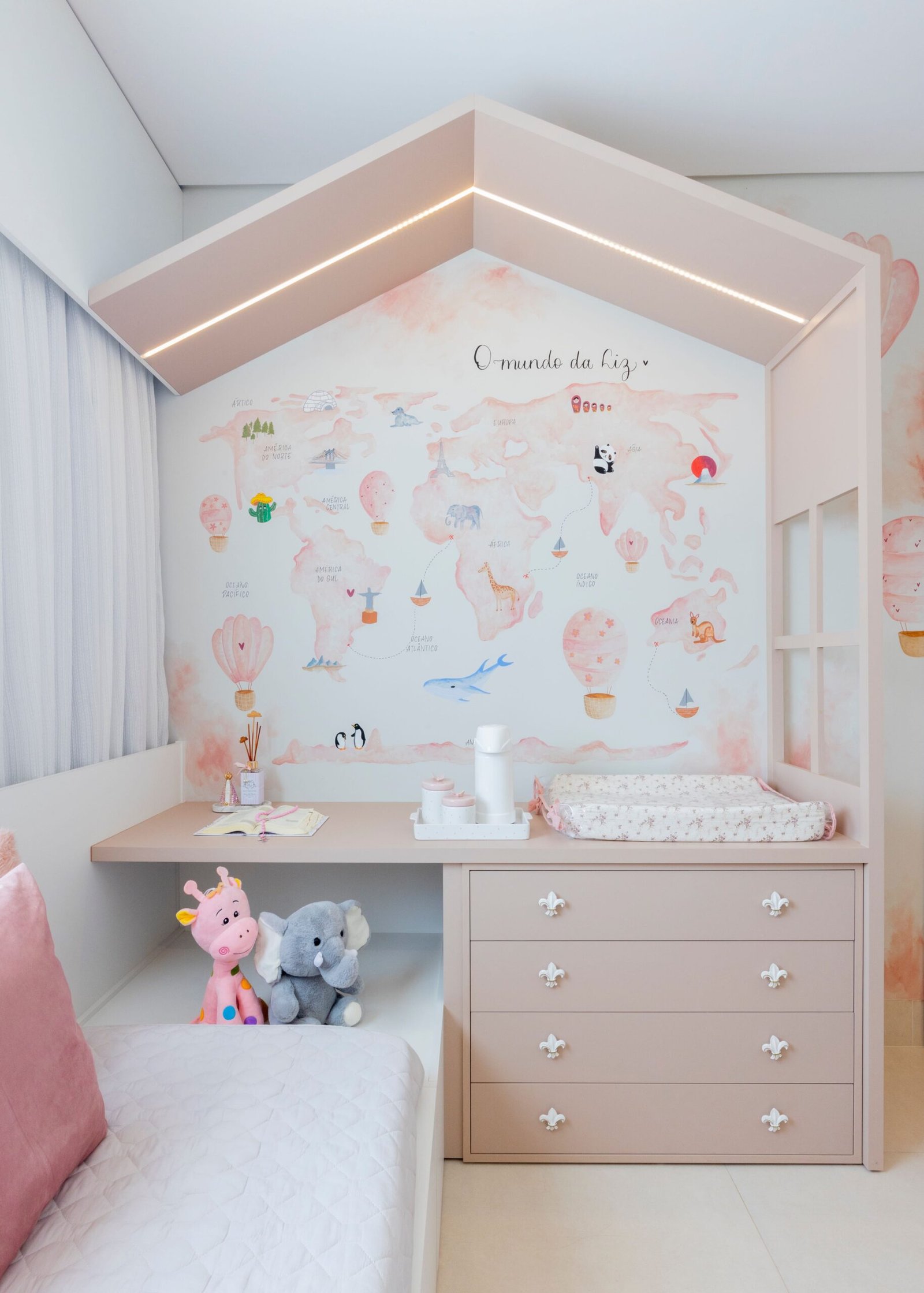 Explorando o mundo desde o primeiro dia! O sonho dessa pequena viajante, começa aqui, em seu quarto. Quando a mamãe da Liz nos procurou ela tinha o desejo de retratar o mapa do mundo, porem não sabia como, foi então que sugerimos um letring todo lúdico e o resultado ficou muito além do esperado, um verdadeiro charme esse quarto.