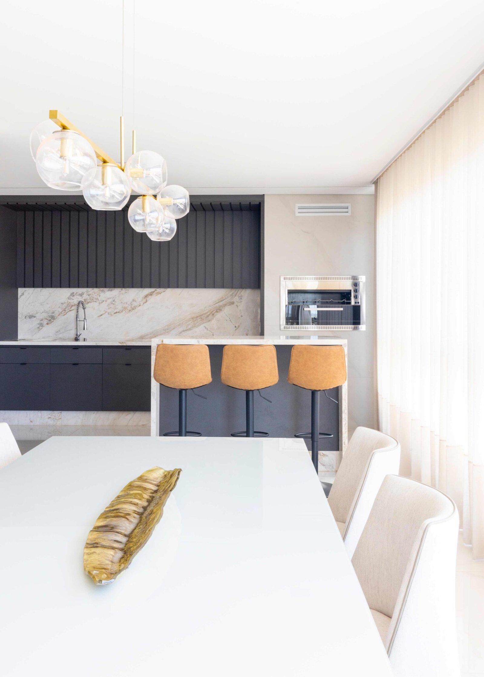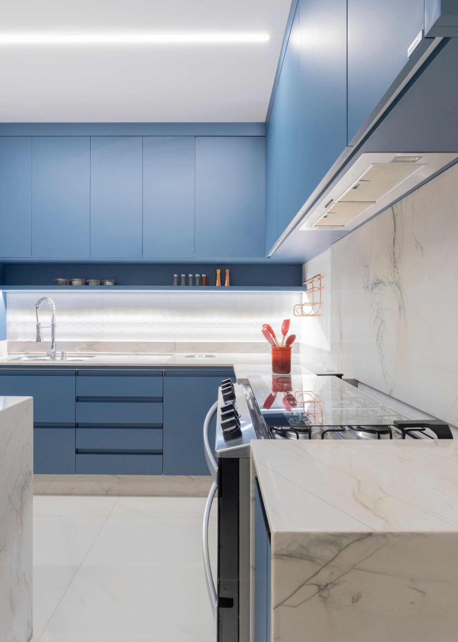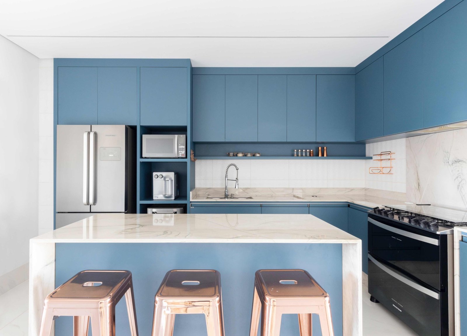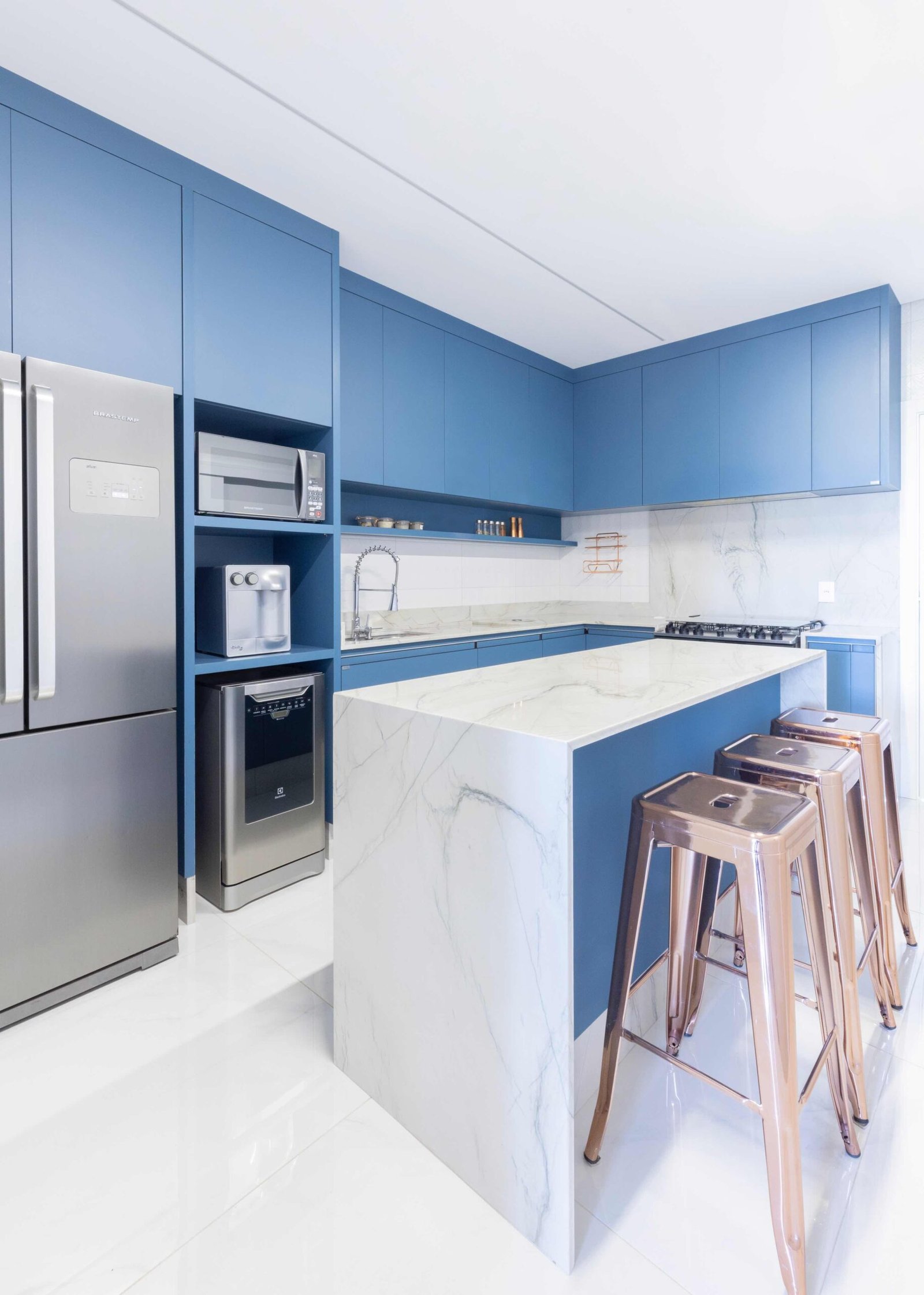 Apartamento JM, um projeto com detalhes únicos. O apartamento possui um conceito aberto, onde todos os ambientes são integrados, no living TV, temos espaço de estar, adega e logo uma sacada gourmet, onde utilizamos o mármore Michelangelo. A cozinha deste apartamento retrata bem a personalidade dos moradores, um espaço totalmente moderno, onde utilizamos marcenaria azul royal e pedra Vena Oro da linha Sensa by Cosentino