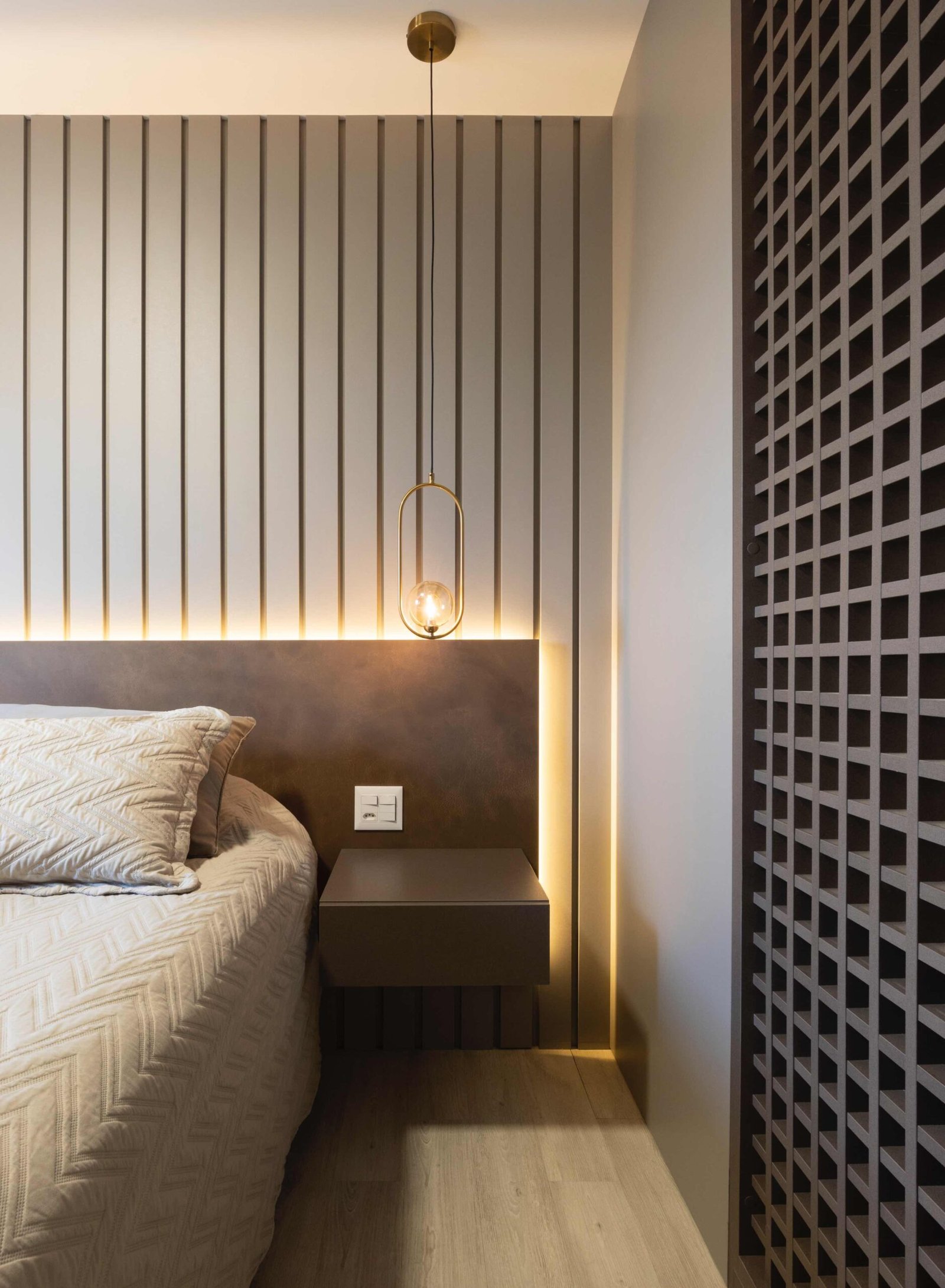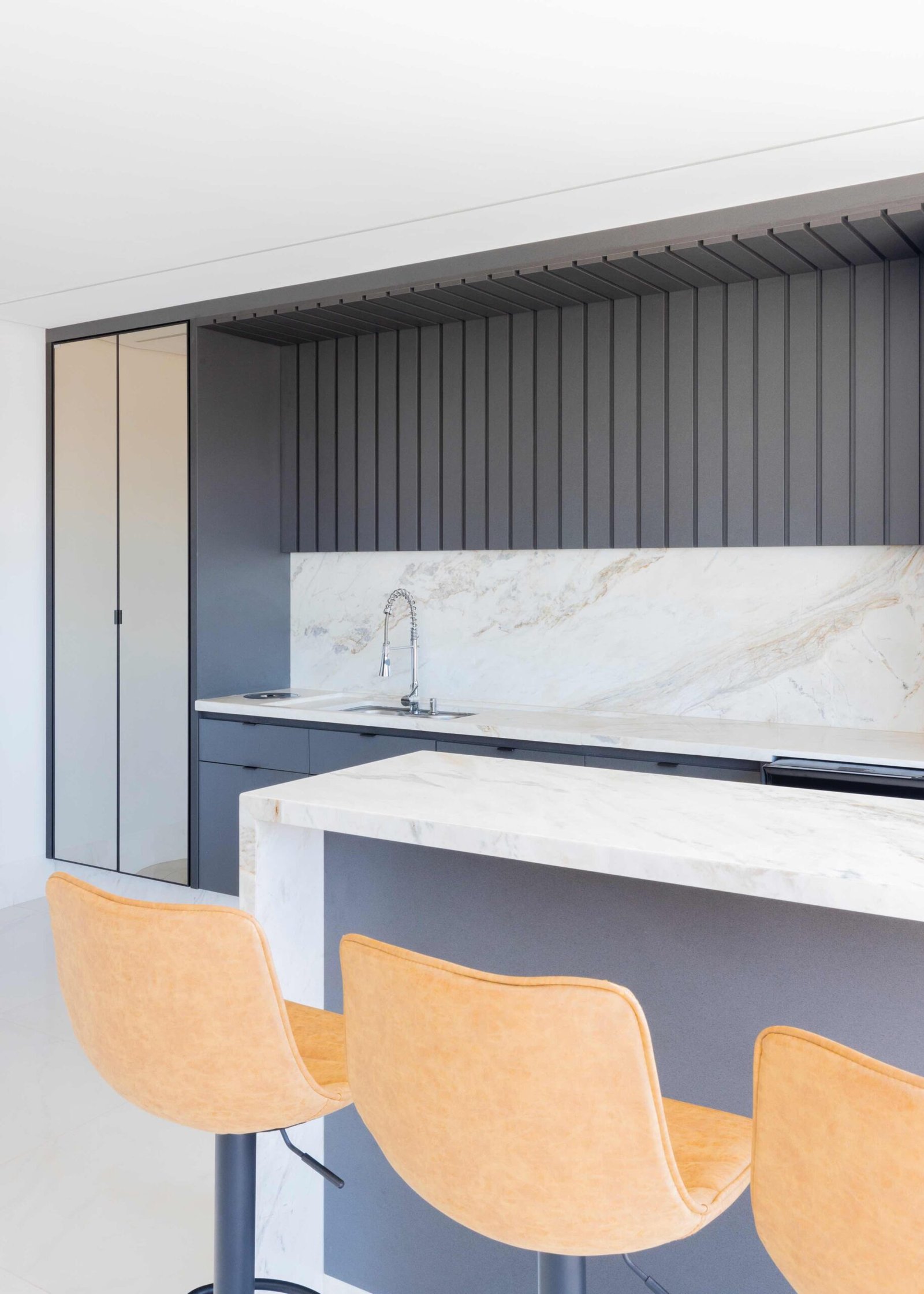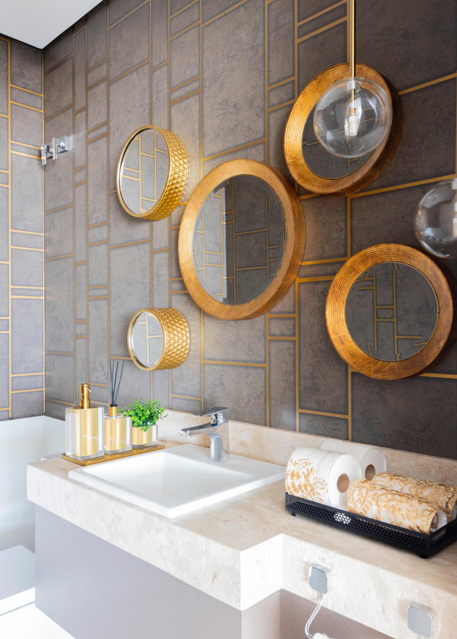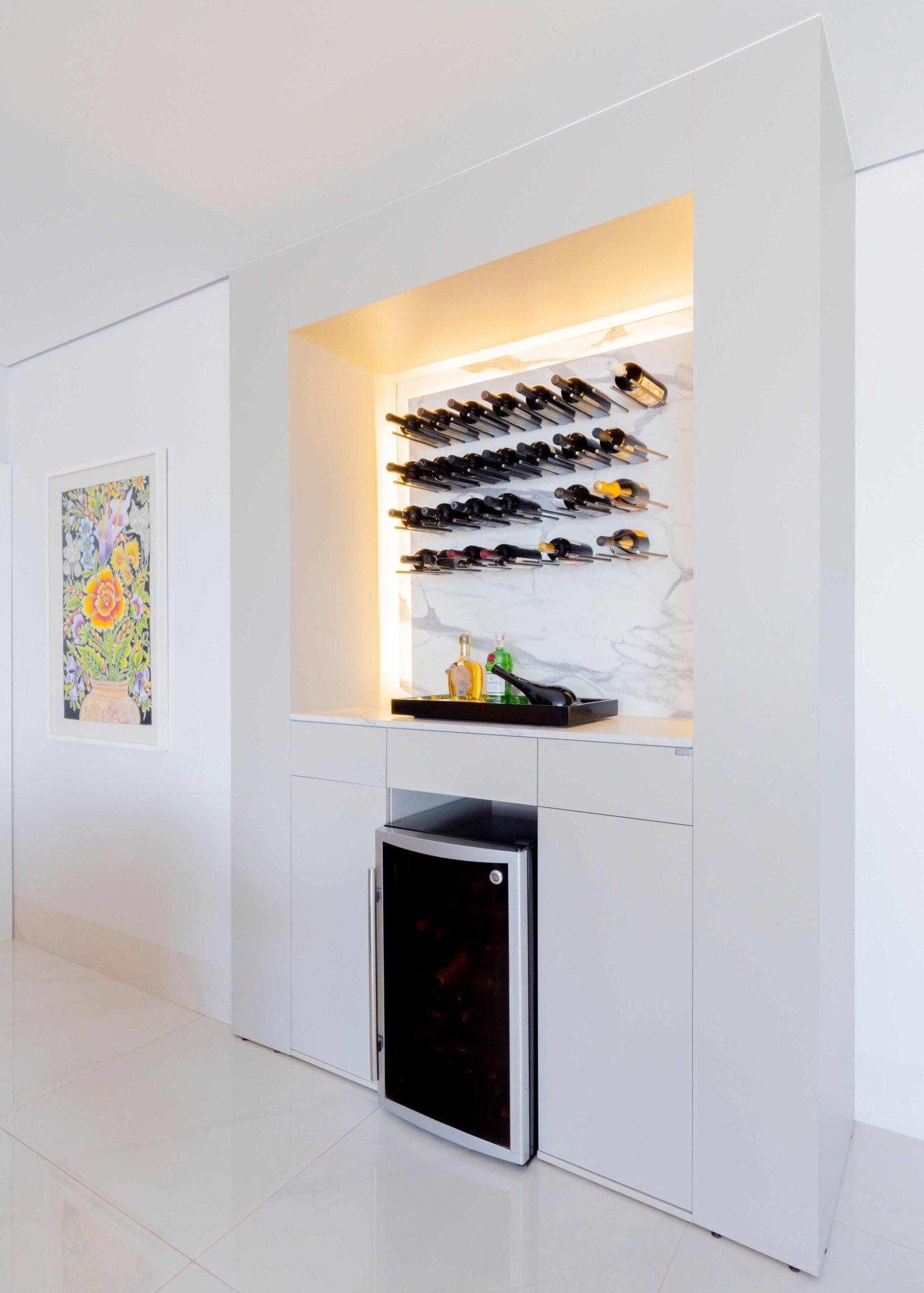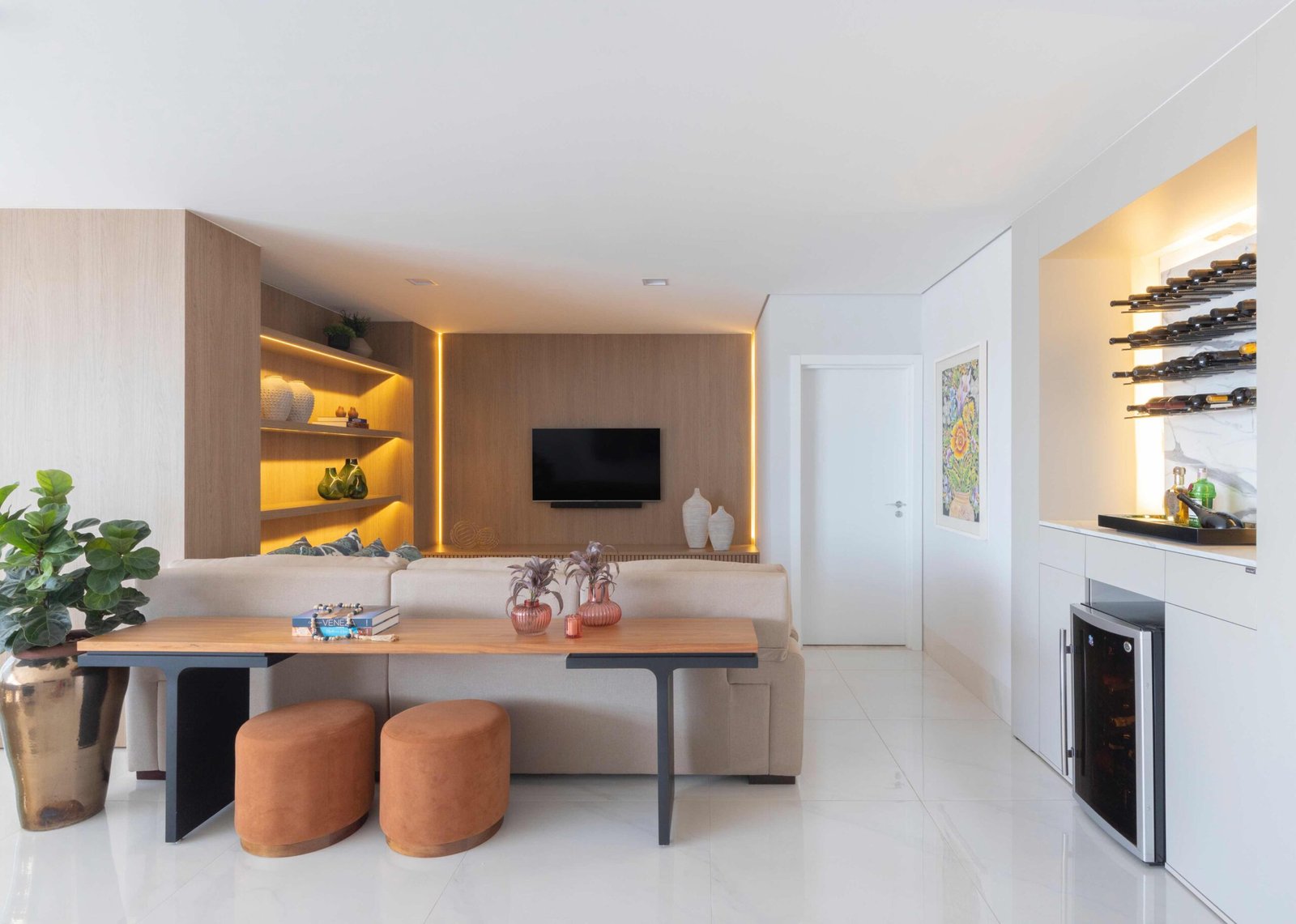 Apartamento JM, um projeto com detalhes únicos. O apartamento possui um conceito aberto, onde todos os ambientes são integrados, no living TV, temos espaço de estar, adega e logo uma sacada gourmet, onde utilizamos o mármore Michelangelo. A cozinha deste apartamento retrata bem a personalidade dos moradores, um espaço totalmente moderno, onde utilizamos marcenaria azul royal e pedra Vena Oro da linha Sensa by Cosentino