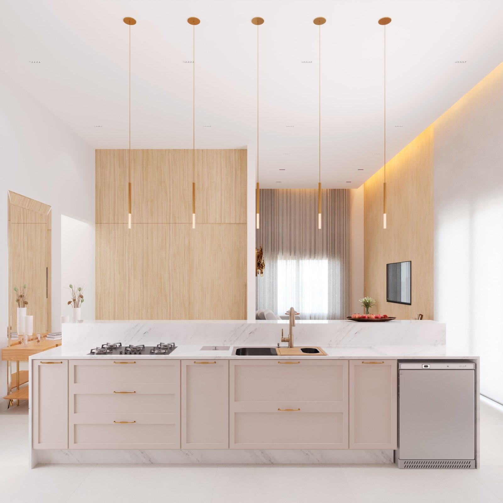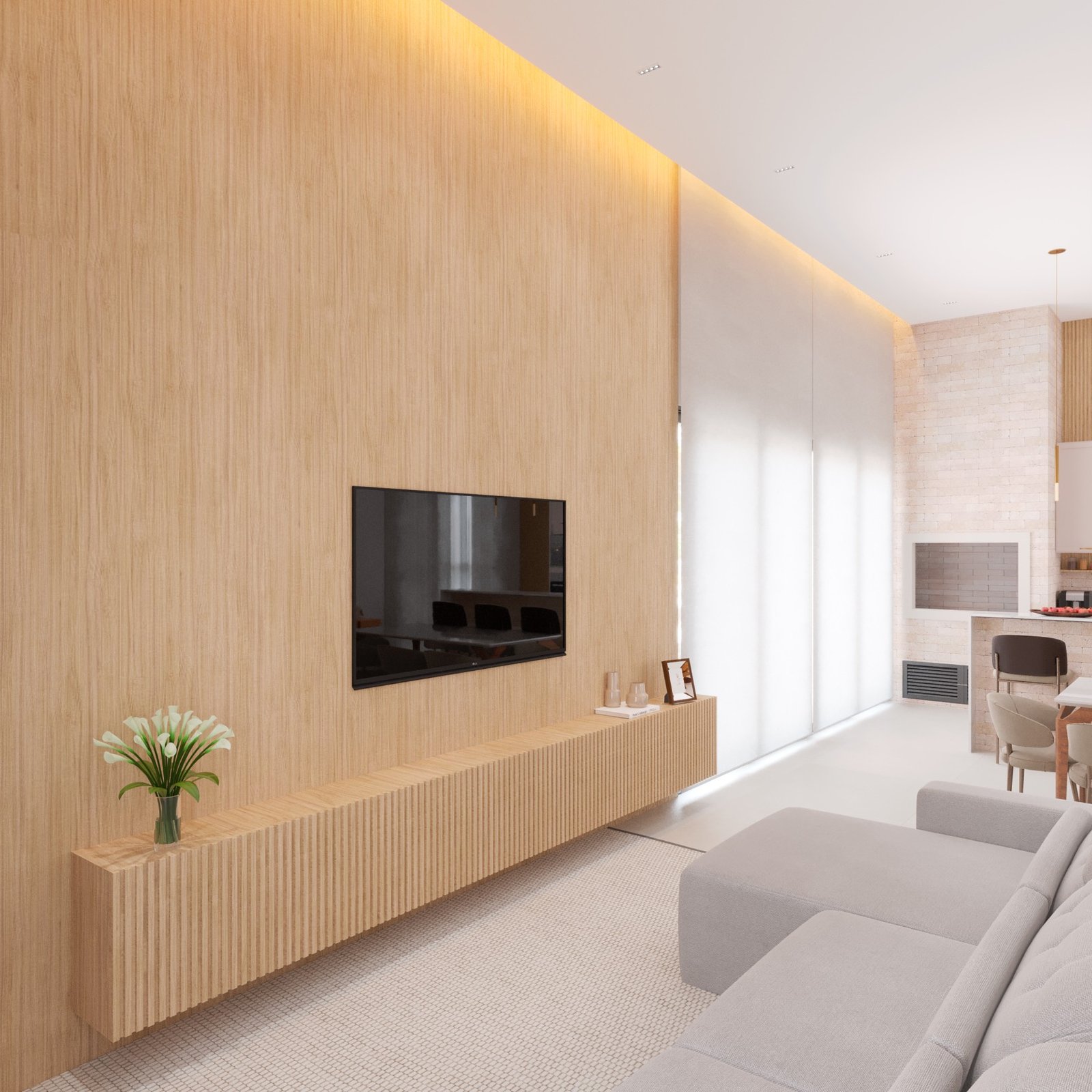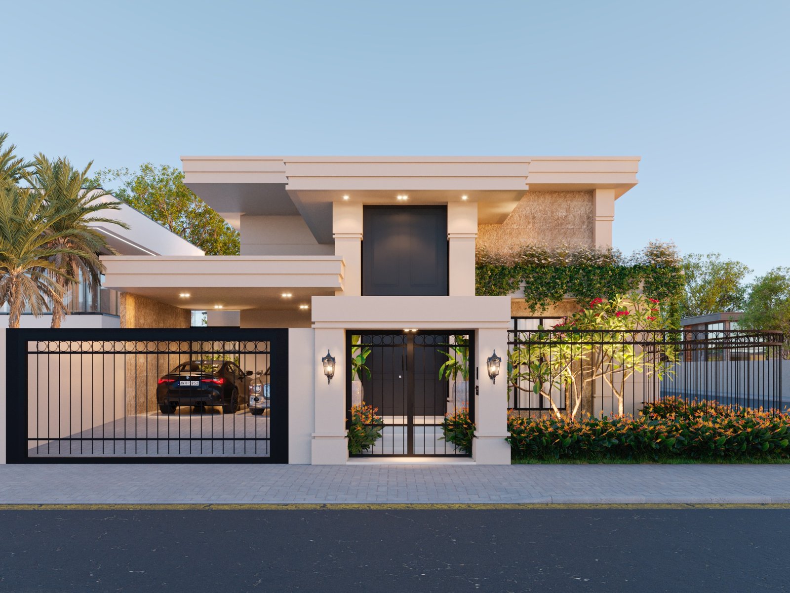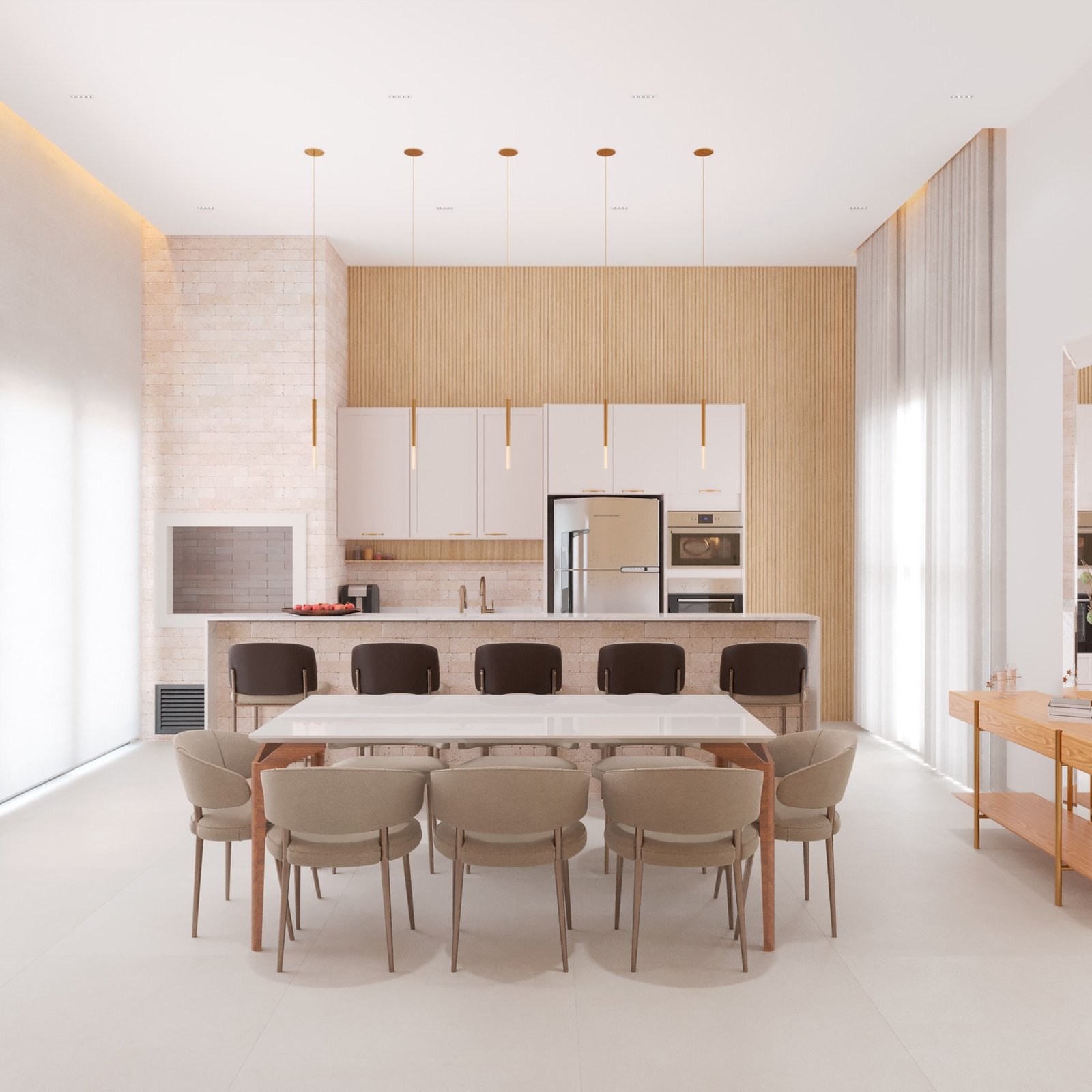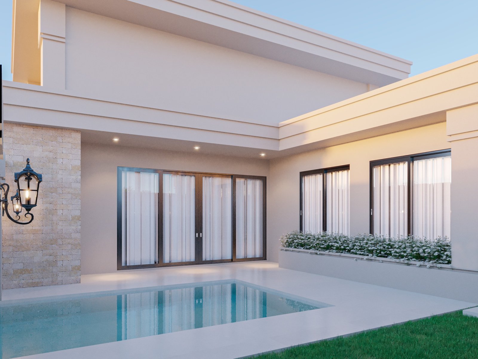 As residências neoclássicas sempre são um verdadeiro charme, aqui neste projeto de 220m² podemos ver toda a imponência de uma casa com molduras, pedra travertino, esquadrias pretas e um jardim lindíssimo. Todo o charme do clássico também é refletido nos interiores da residência, onde a marcenaria possui molduras clássicas e MDF madeirado que trás um aconchego especial.