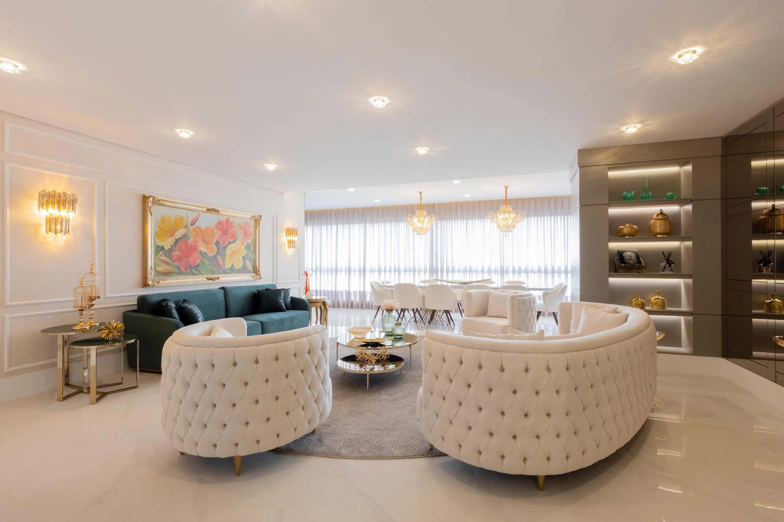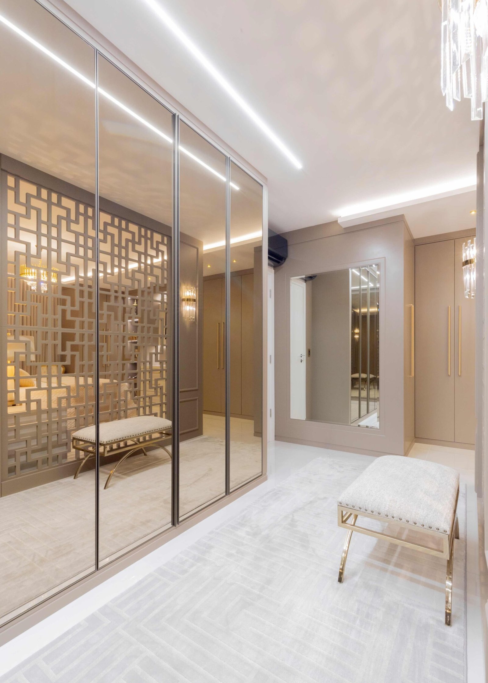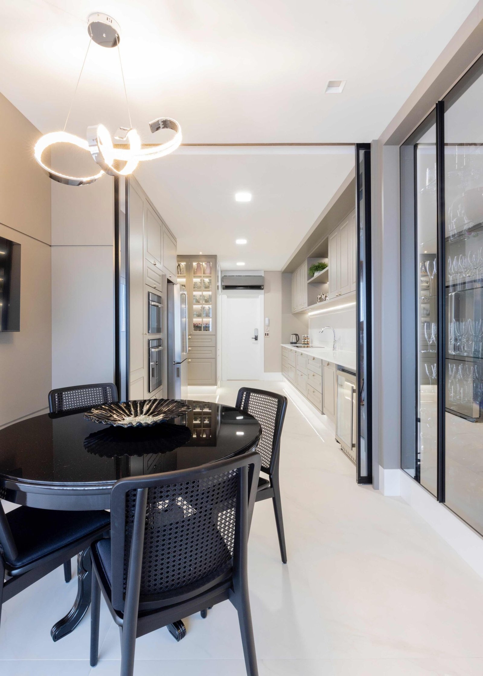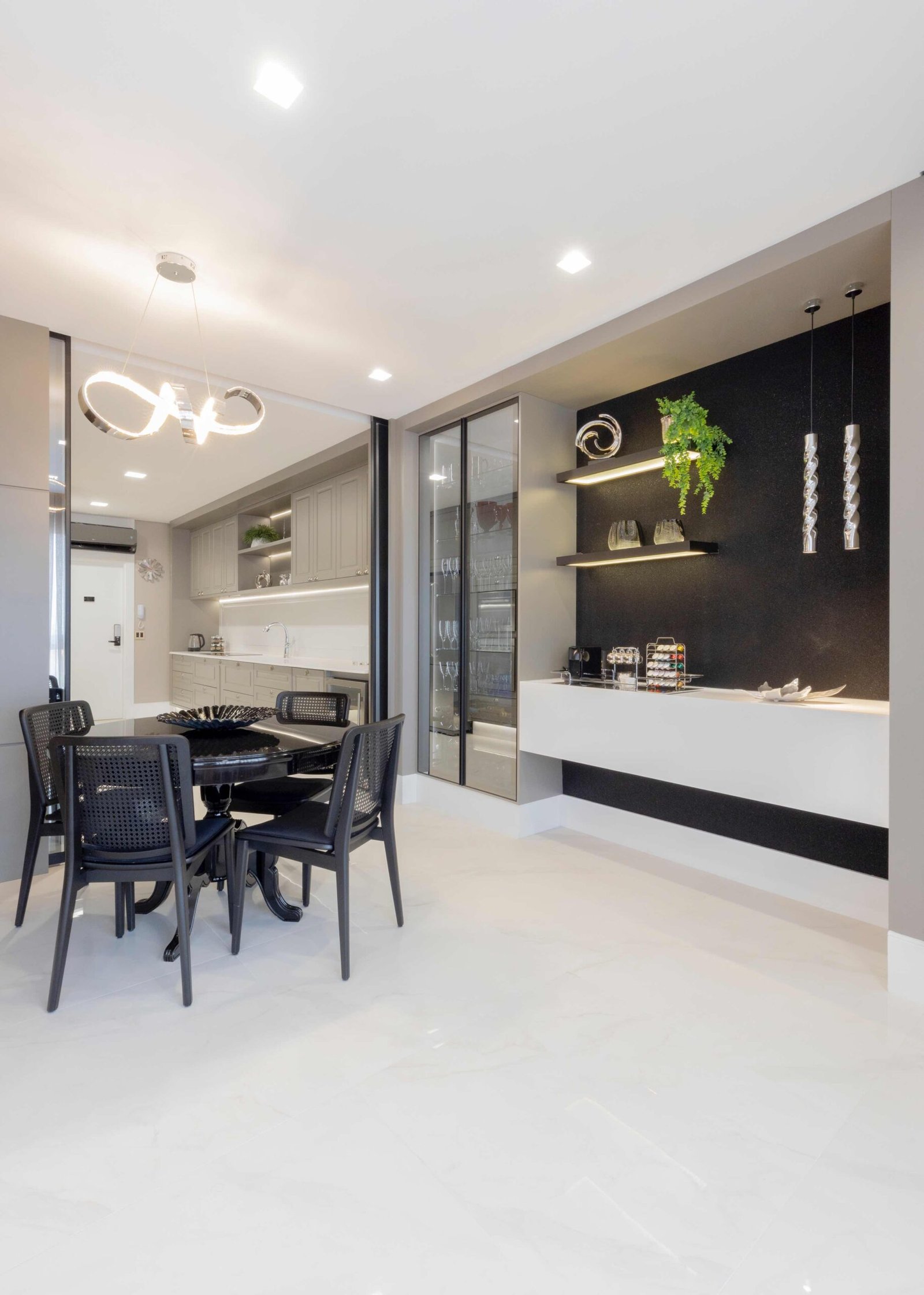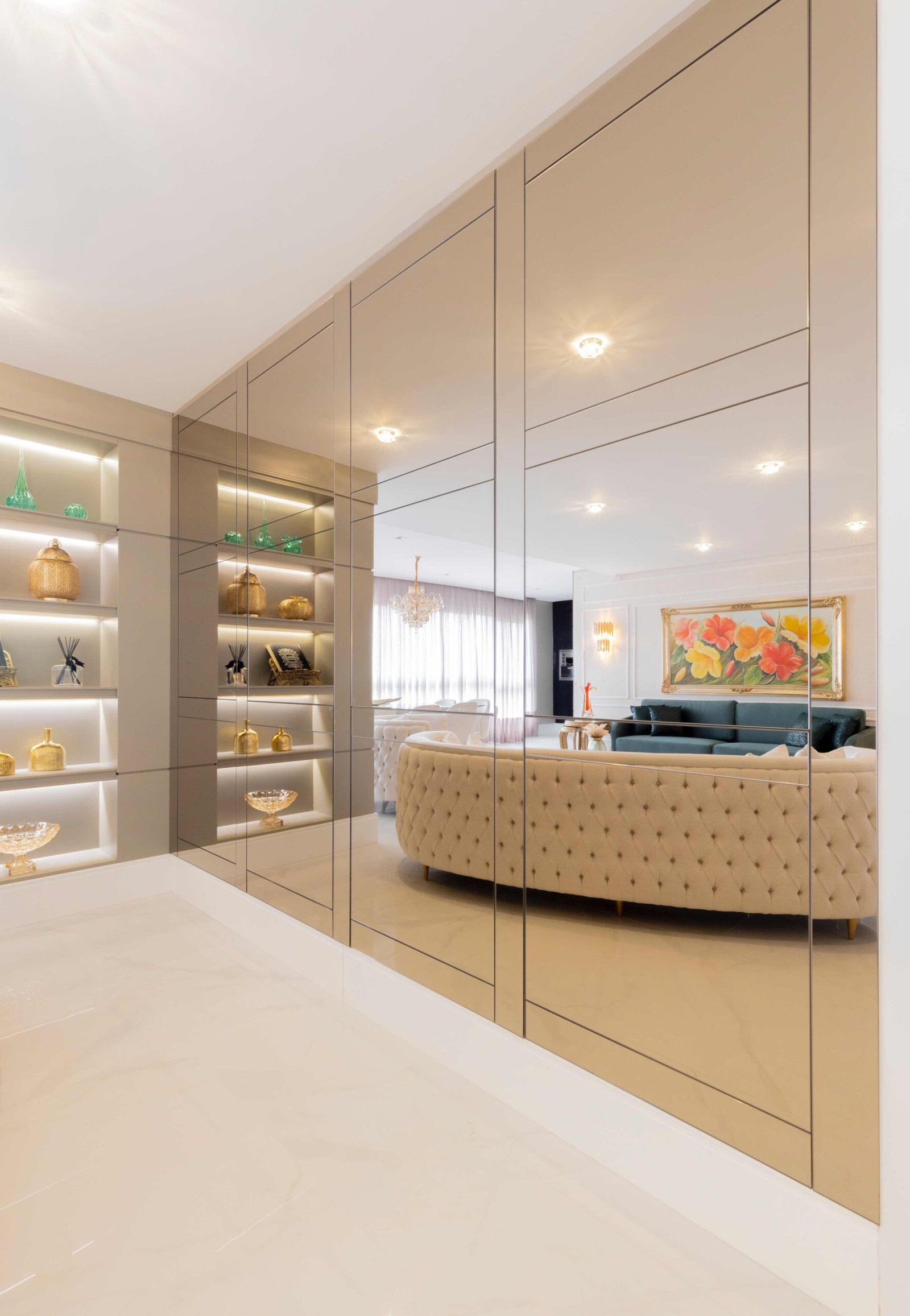 Apartamento N/R, um projeto moderno, ousado e lindíssimo. Logo na entrada do apartamento nós temos um living com uma marcenaria toda revestida em espelhos, onde não é possível identificar que ali se trata de um armário, onde os clientes guardam diversas lembranças de viagens, álbuns de família entre outros itens, também no living um espaço dedicado a uma tela que está na família a mais de 50 anos. O conceito era um projeto moderno com alguns ambientes pontuais com marcenaria clássica, a cozinha provençal em lacca, com bancadas e rodapés em corian retro iluminado e uma porta que dividia cozinha da sacada gourmet, onde era possível integrar esses dois ambientes.