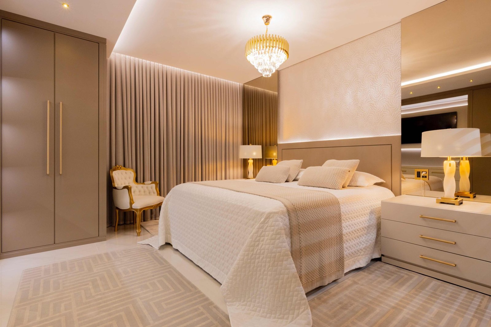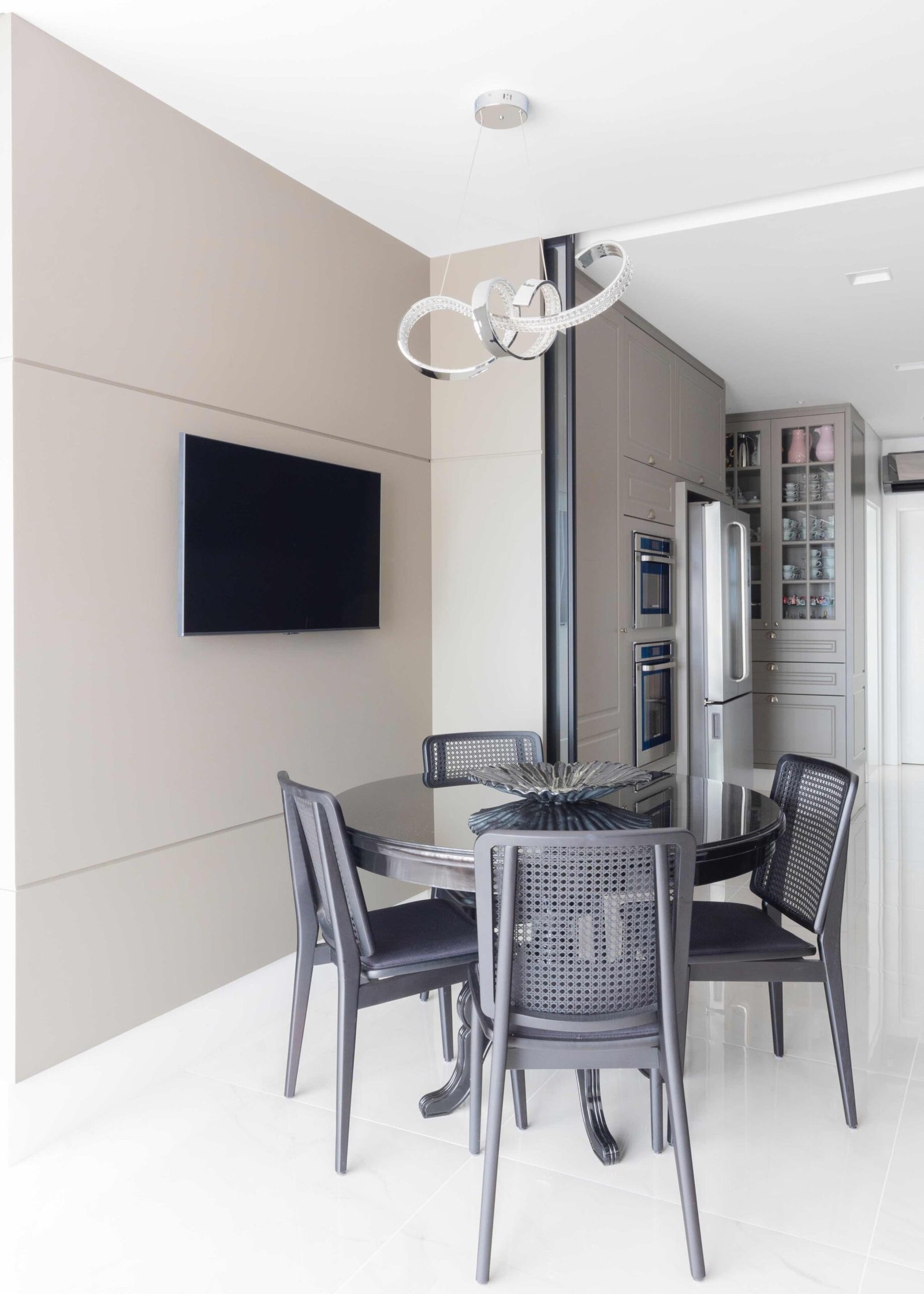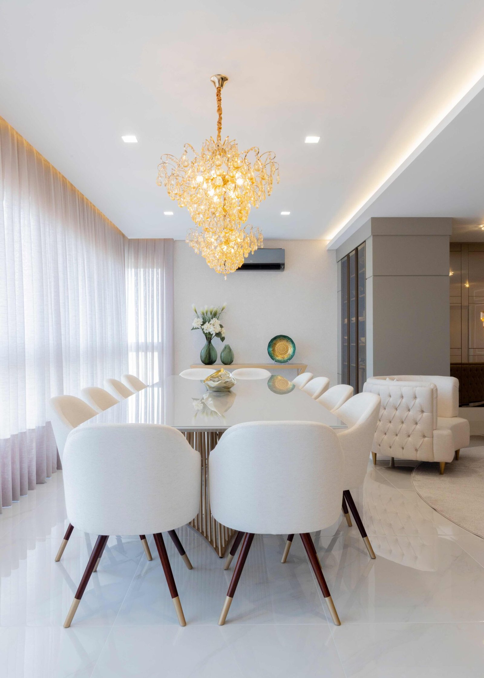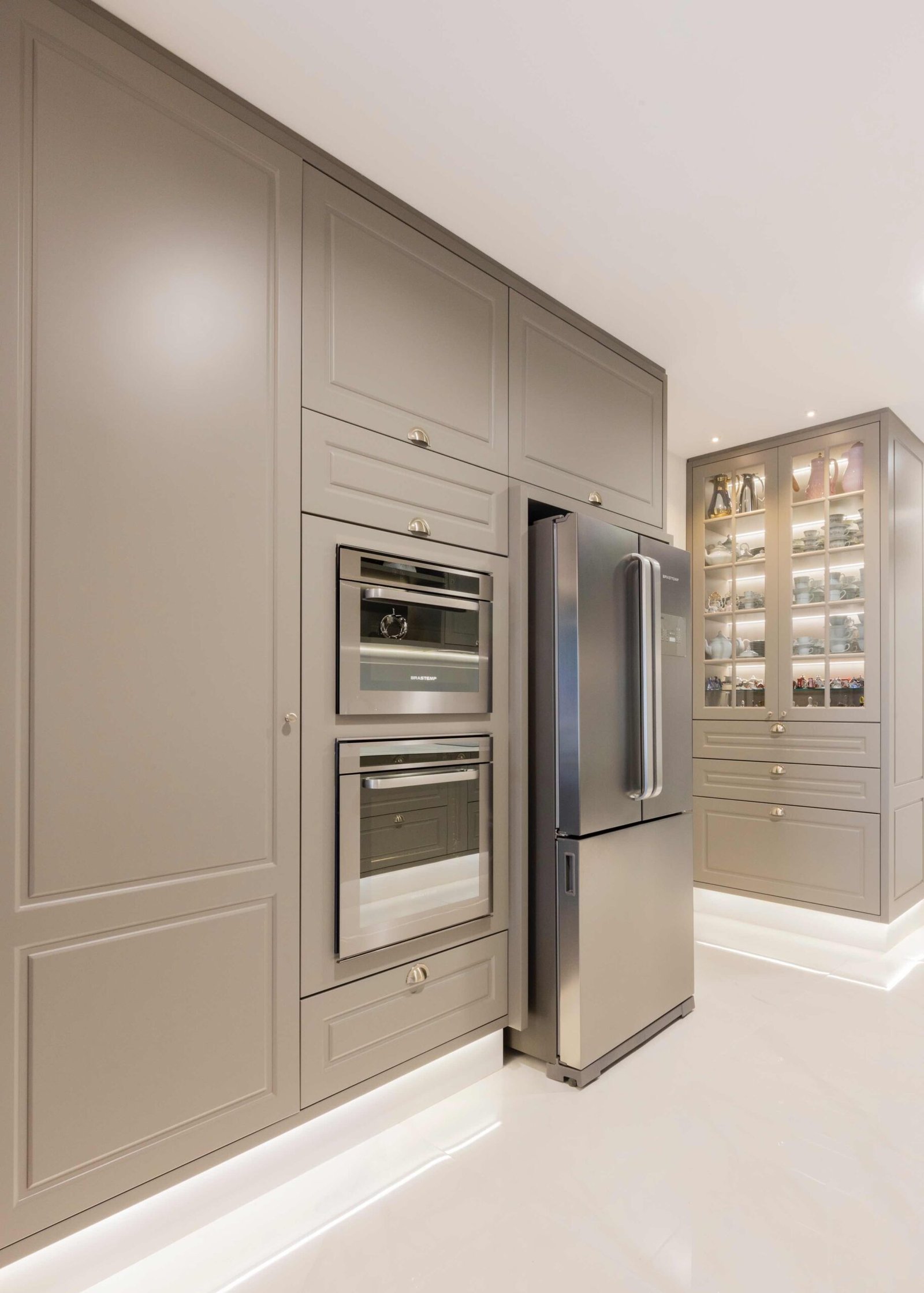Apartamento N/R, um projeto moderno, ousado e lindíssimo. Logo na entrada do apartamento nós temos um living com uma marcenaria toda revestida em espelhos, onde não é possível identificar que ali se trata de um armário, onde os clientes guardam diversas lembranças de viagens, álbuns de família entre outros itens, também no living um espaço dedicado a uma tela que está na família a mais de 50 anos. O conceito era um projeto moderno com alguns ambientes pontuais com marcenaria clássica, a cozinha provençal em lacca, com bancadas e rodapés em corian retro iluminado e uma porta que dividia cozinha da sacada gourmet, onde era possível integrar esses dois ambientes.