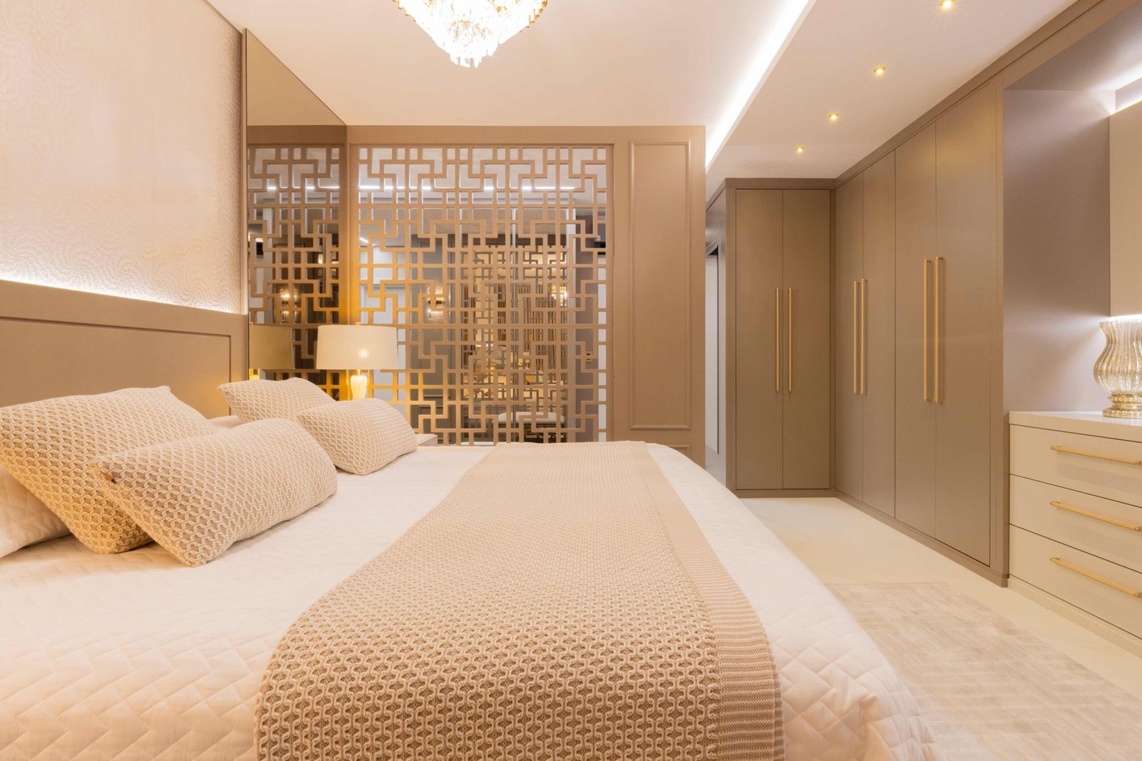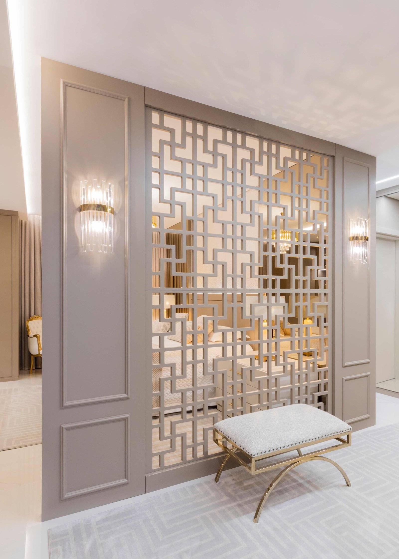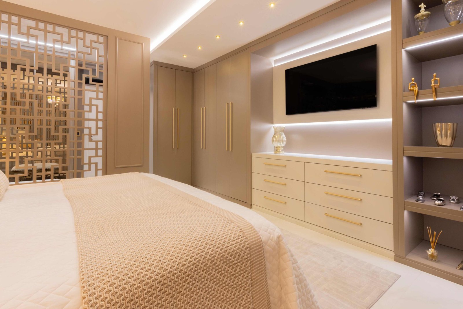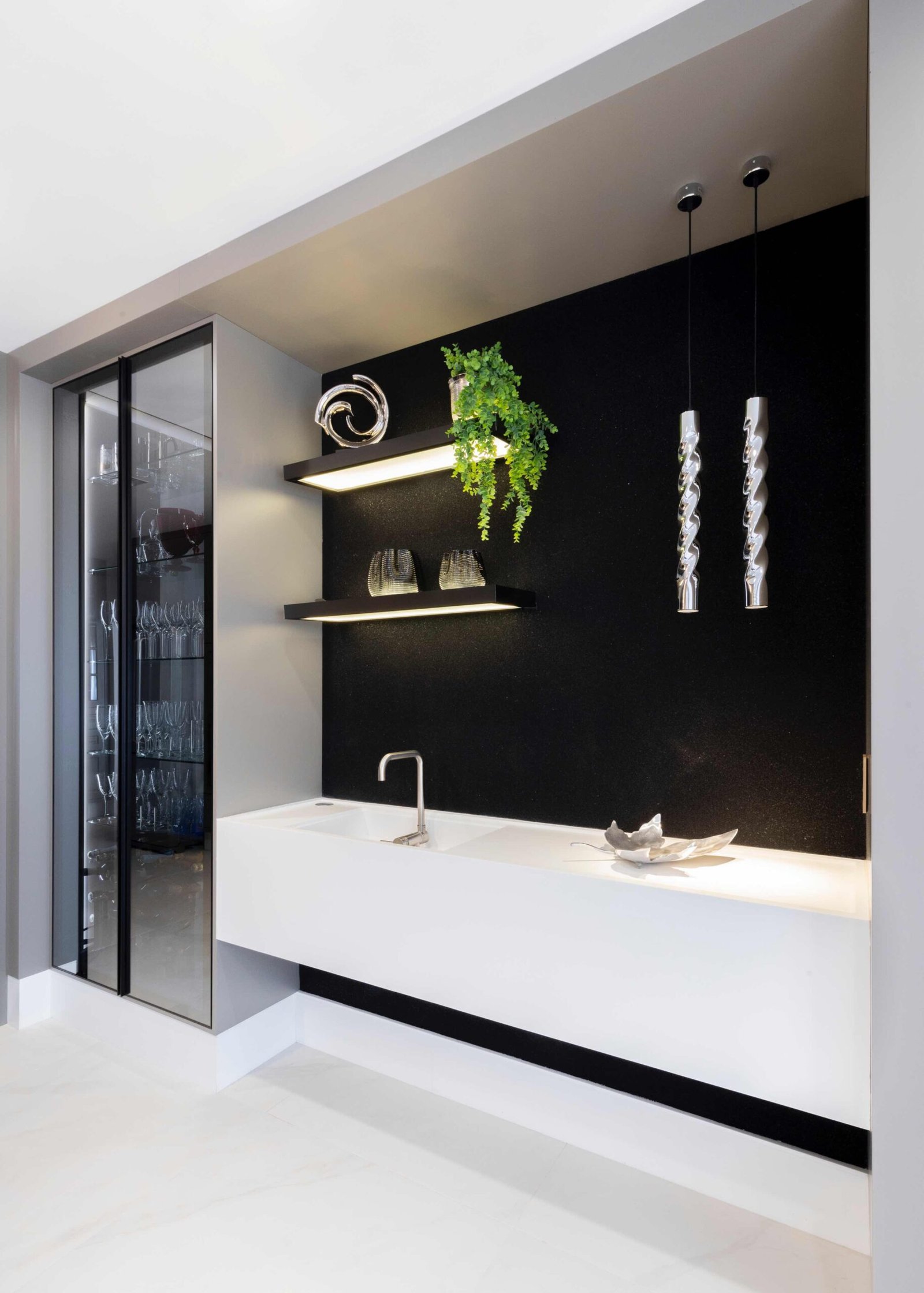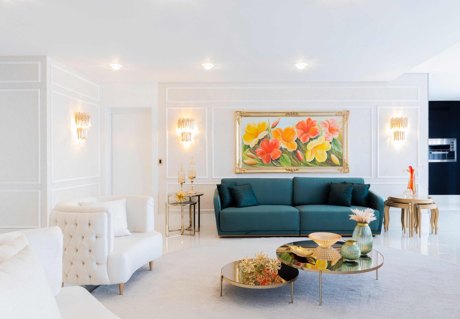 Apartamento N/R, um projeto moderno, ousado e lindíssimo. Logo na entrada do apartamento nós temos um living com uma marcenaria toda revestida em espelhos, onde não é possível identificar que ali se trata de um armário, onde os clientes guardam diversas lembranças de viagens, álbuns de família entre outros itens, também no living um espaço dedicado a uma tela que está na família a mais de 50 anos. O conceito era um projeto moderno com alguns ambientes pontuais com marcenaria clássica, a cozinha provençal em lacca, com bancadas e rodapés em corian retro iluminado e uma porta que dividia cozinha da sacada gourmet, onde era possível integrar esses dois ambientes.