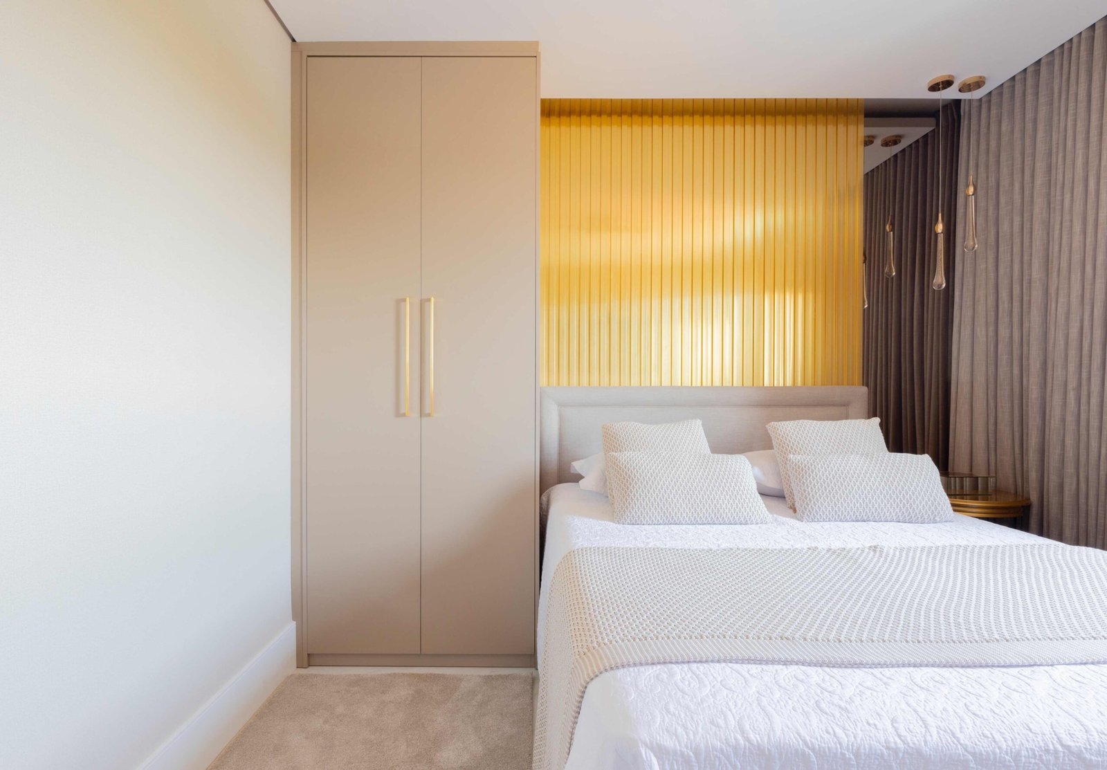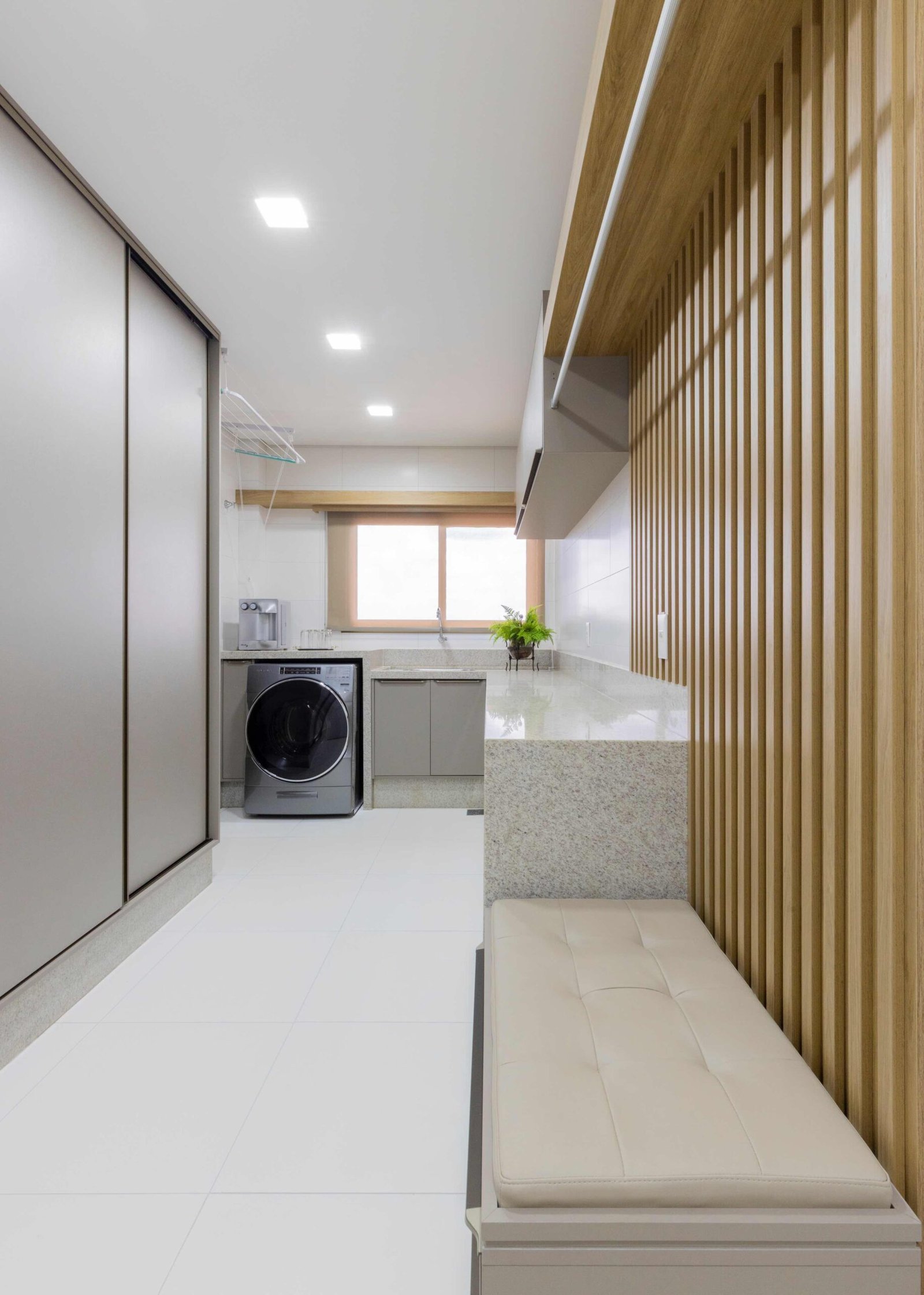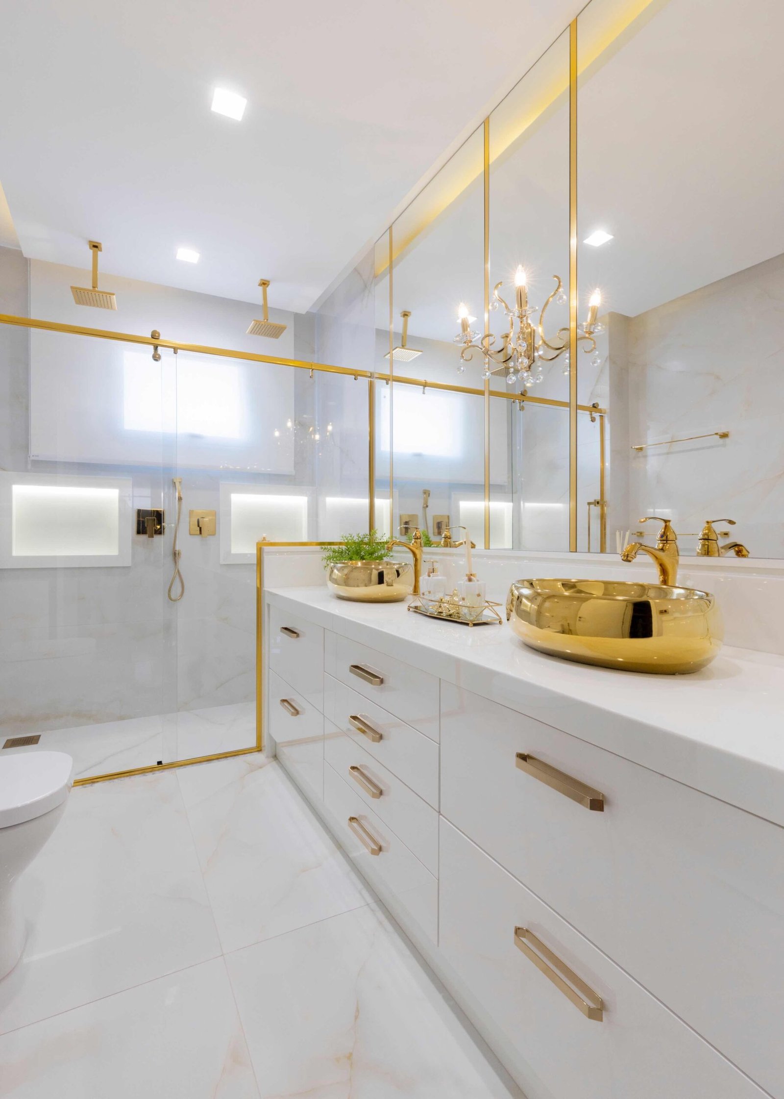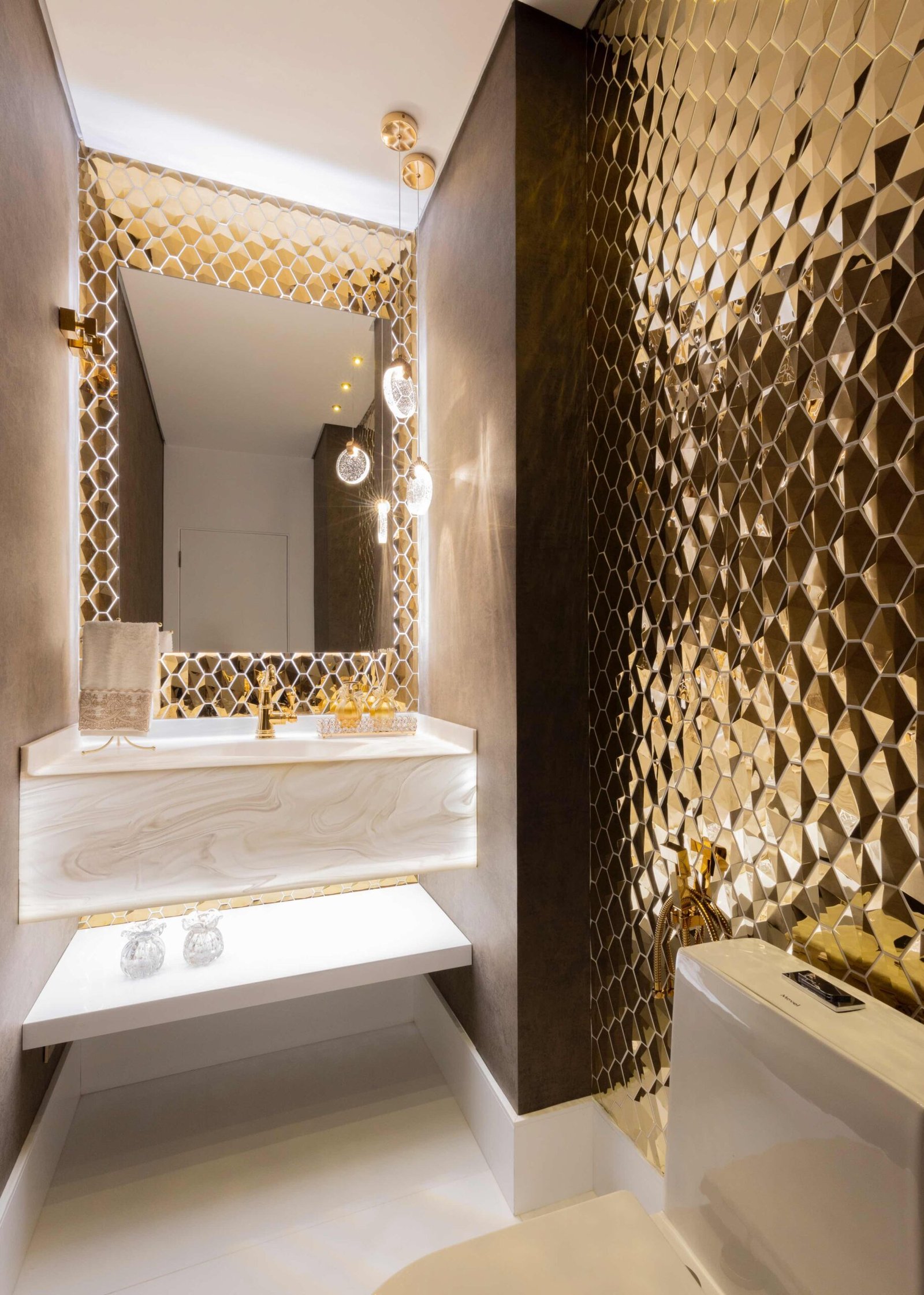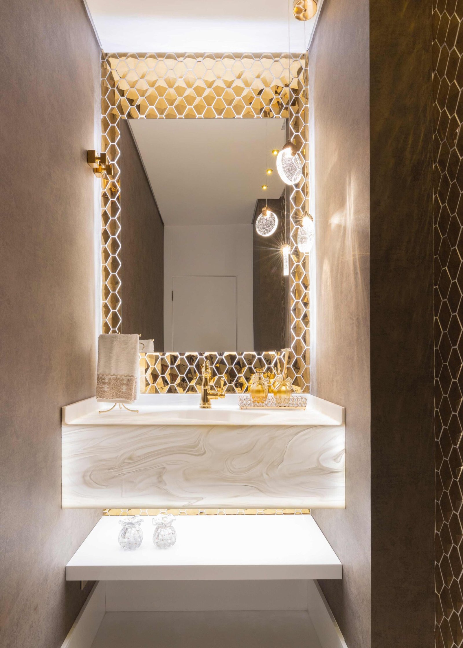 Apartamento N/R, um projeto moderno, ousado e lindíssimo. Logo na entrada do apartamento nós temos um living com uma marcenaria toda revestida em espelhos, onde não é possível identificar que ali se trata de um armário, onde os clientes guardam diversas lembranças de viagens, álbuns de família entre outros itens, também no living um espaço dedicado a uma tela que está na família a mais de 50 anos. O conceito era um projeto moderno com alguns ambientes pontuais com marcenaria clássica, a cozinha provençal em lacca, com bancadas e rodapés em corian retro iluminado e uma porta que dividia cozinha da sacada gourmet, onde era possível integrar esses dois ambientes.